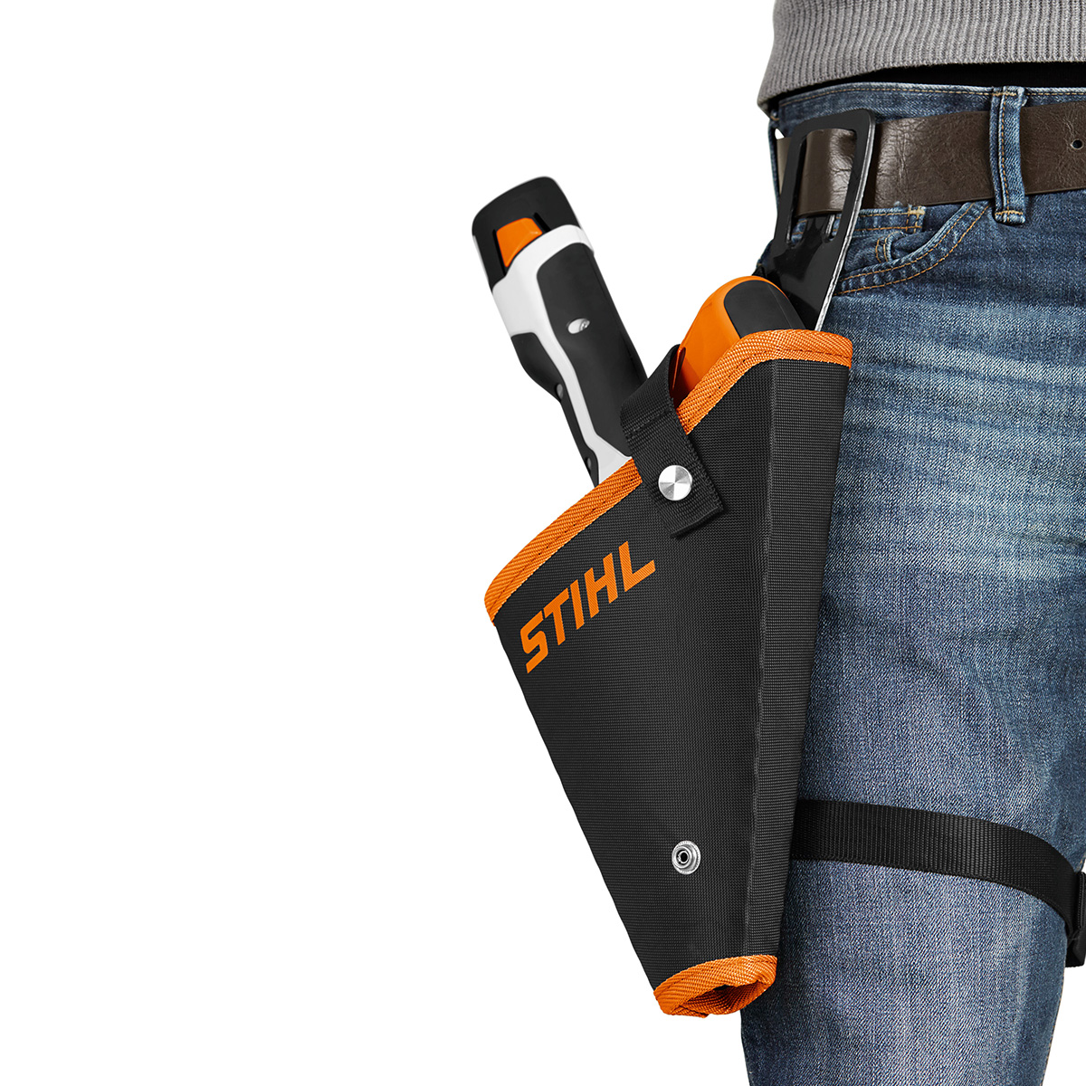 La funda para el Podador a batería GTA 26 permite un traslado confortable y seguro del equipo, ya que posee una lengüeta de fijación para el cinturón y una correa de amarre ajustable para la pierna. Su interior reforzado y la correa de enganche (con broches de cierre rápido) ofrecen un alto nivel de protección al mantenerlo enfundado y, a la vez, máxima comodidad para desenfundar rápidamente al realizar los trabajos. Encuéntrelo en la Red de Distribuidores Exclusivos STIHL en todo Chile.